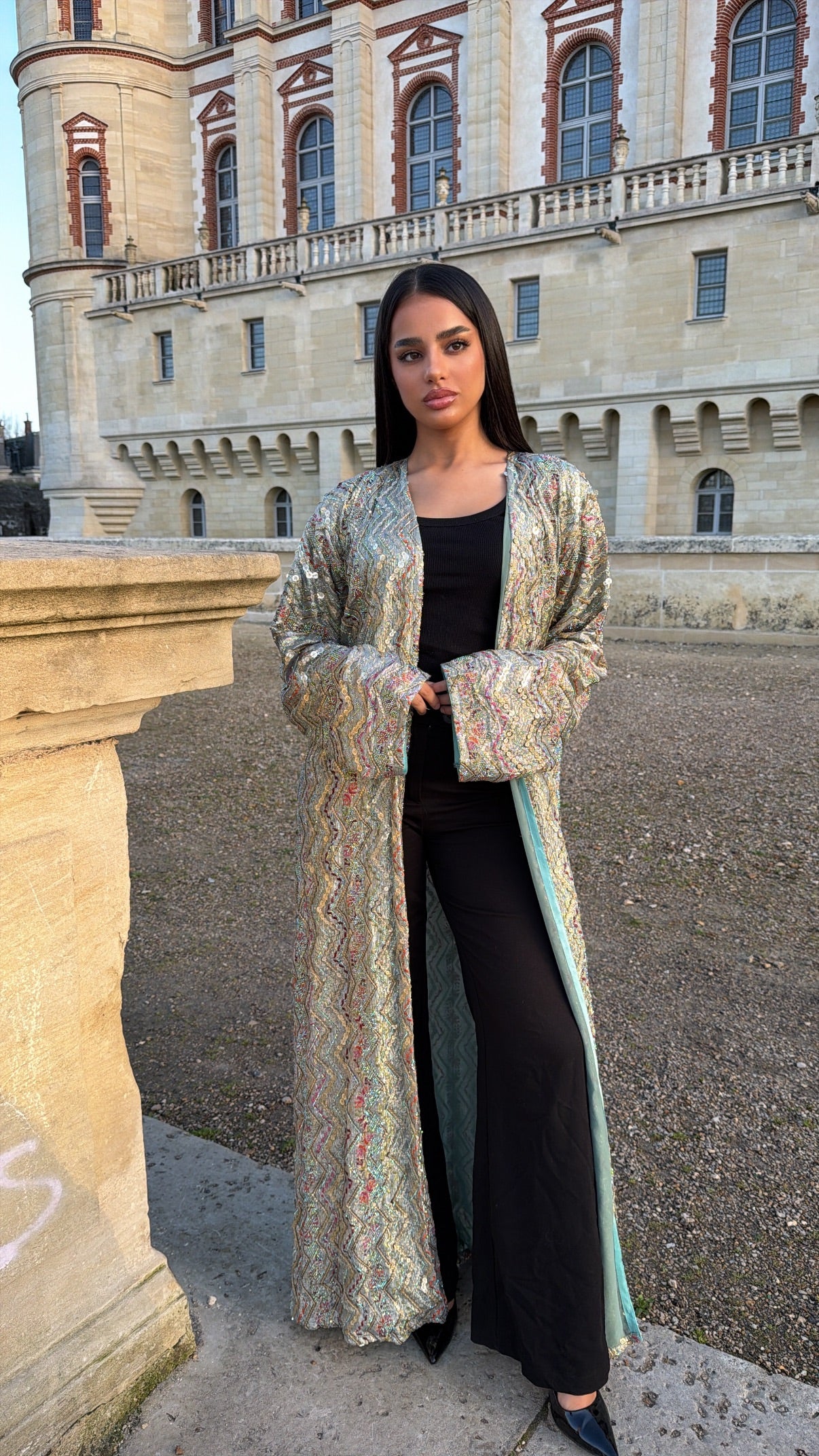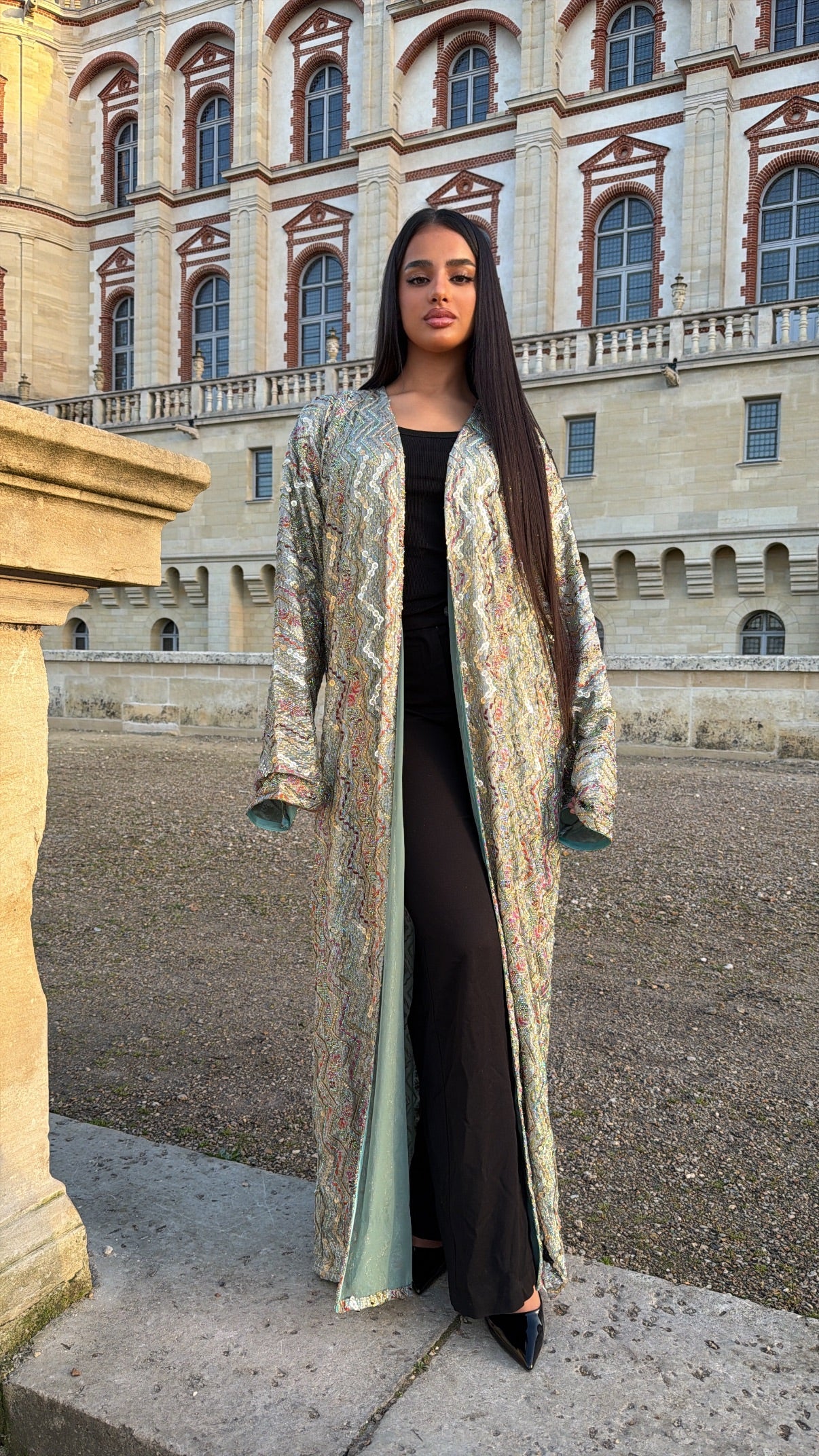 Son tissu brocart, tissé de fils dorés et irisés, diffuse un éclat subtil à chaque mouvement.