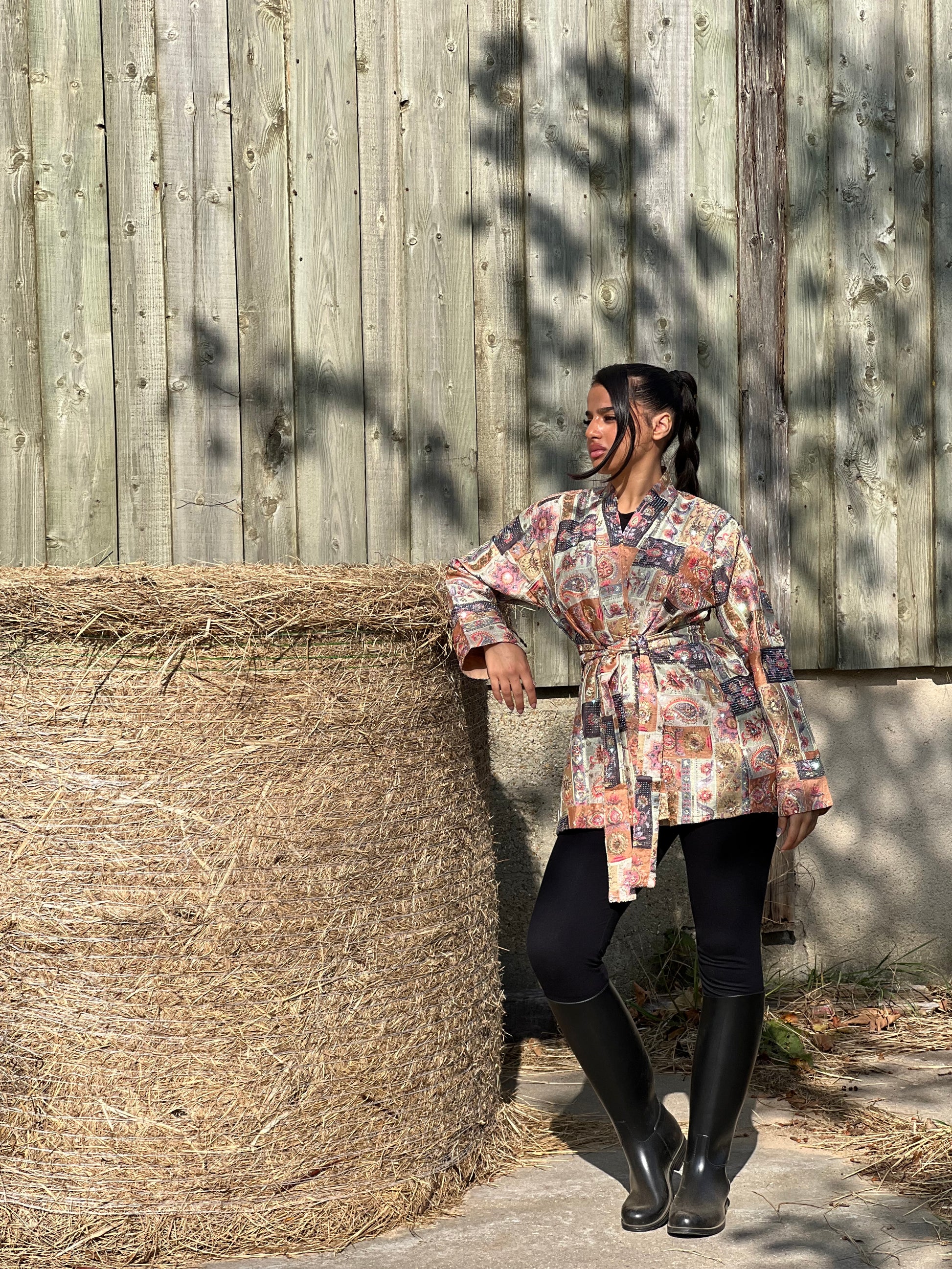 Découvrez la version Ambre du Kimono Essence Unique : une variation chaleureuse et intense de ce modèle signature. Son tissu précieux mélange des tons cuivrés, dorés, bruns et rosés, brodés de motifs orientaux et ornés de sequins qui captent la lumière à chaque mouvement.