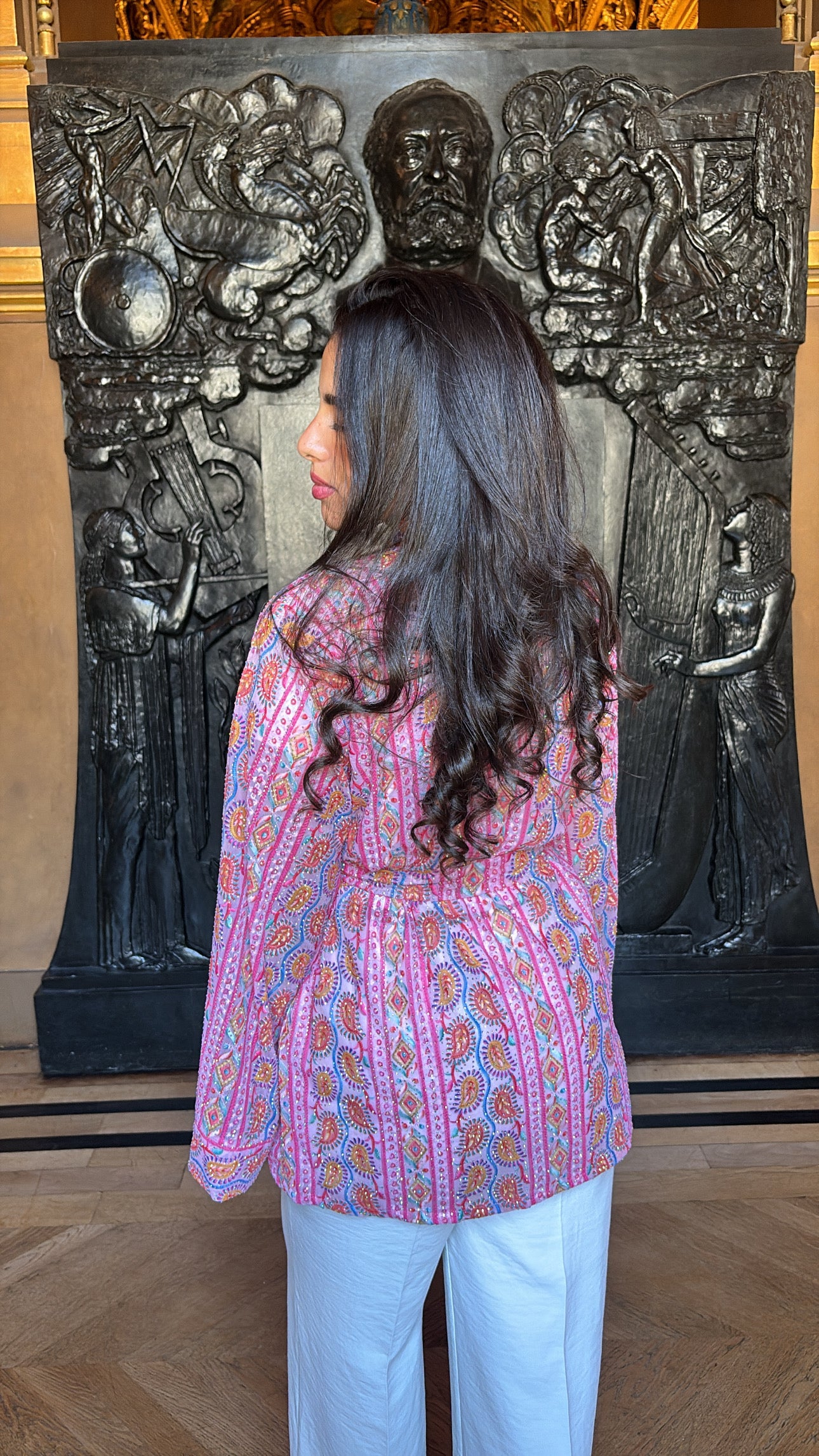 Ce kimono court se distingue par son tissu richement brodé de motifs orientaux et ses touches de strass délicatement posées à la main. Une pièce audacieuse, où le rose intense s’allie à des nuances éclatantes de bleu, orange