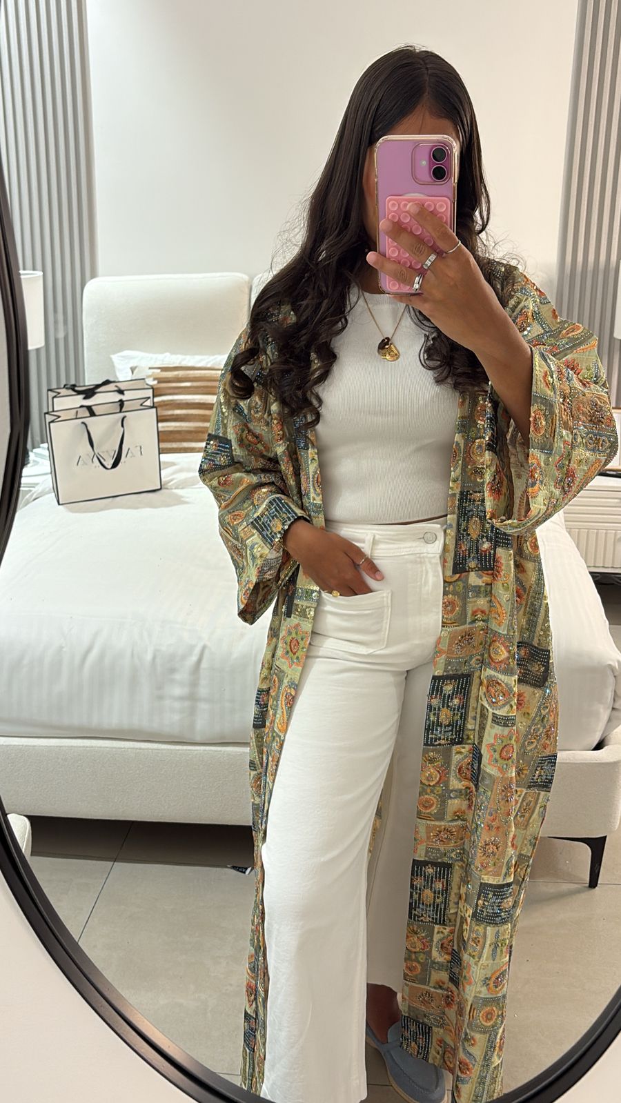 Chaque imprimé raconte une histoire : fleurs stylisées, ornements inspirés de l'art, et détails dorés qui rappellent la richesse des broderies orientales. Les couleurs chaudes : vert pomme, beige, doré et touches sombres en font une pièce parfaite pour l’été, à porter aussi bien en journée qu’en soirée.