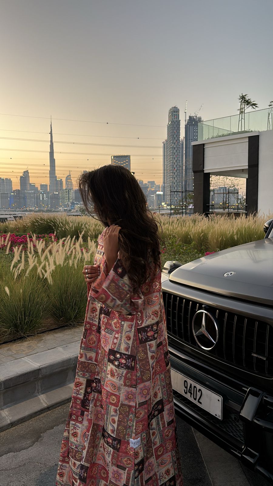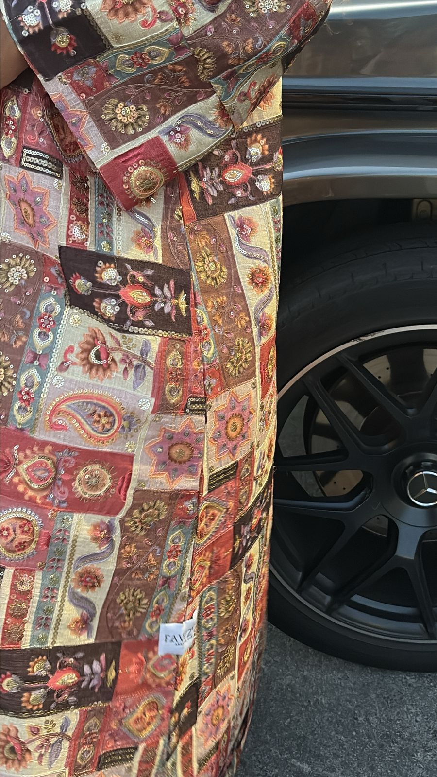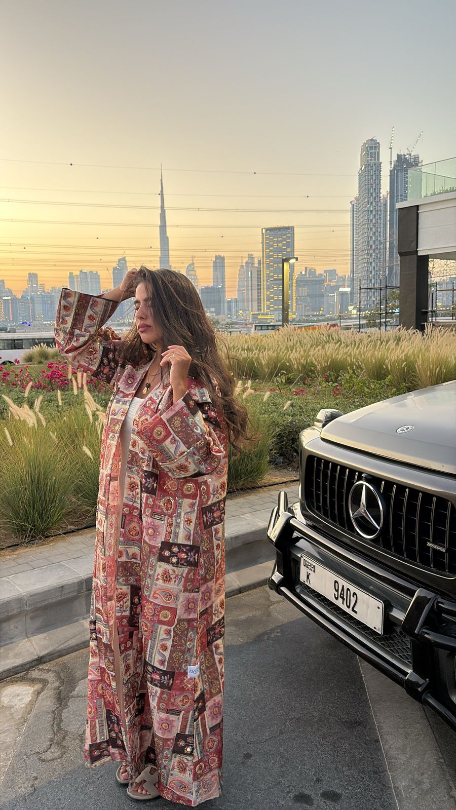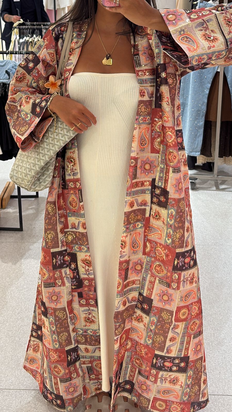Chaque imprimé raconte une histoire : fleurs stylisées, ornements inspirés de l'art, et détails dorés qui rappellent la richesse des broderies orientales. Les couleurs chaudes : brique, beige, doré et touches sombres en font une pièce parfaite pour l’été, à porter aussi bien en journée qu’en soirée.
