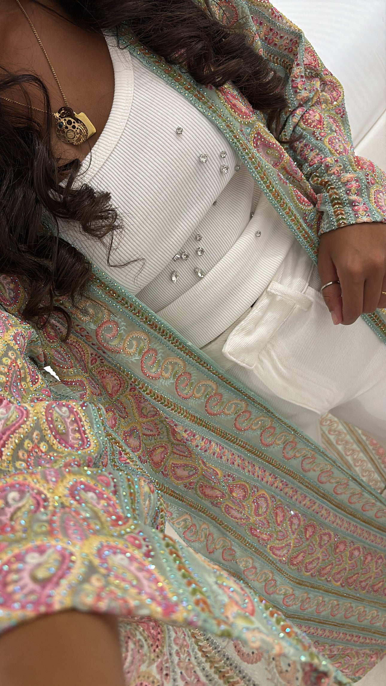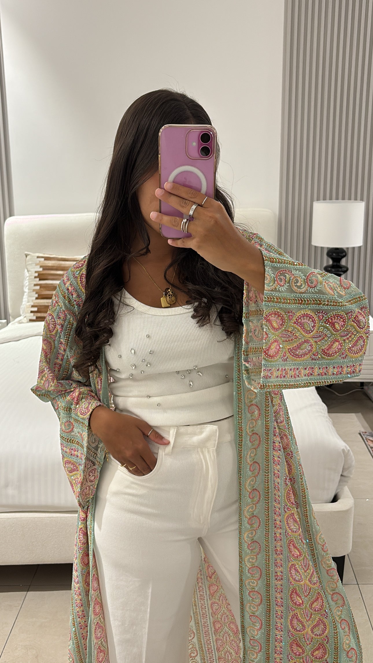 Laisse-toi séduire par SAHEEL, un kimono mint green d’exception confectionné à partir d’un véritable tissu traditionnel, sélectionné avec soin. Chaque détail a été réalisé à la main, avec une précision et une passion qui se ressentent dans chaque couture.