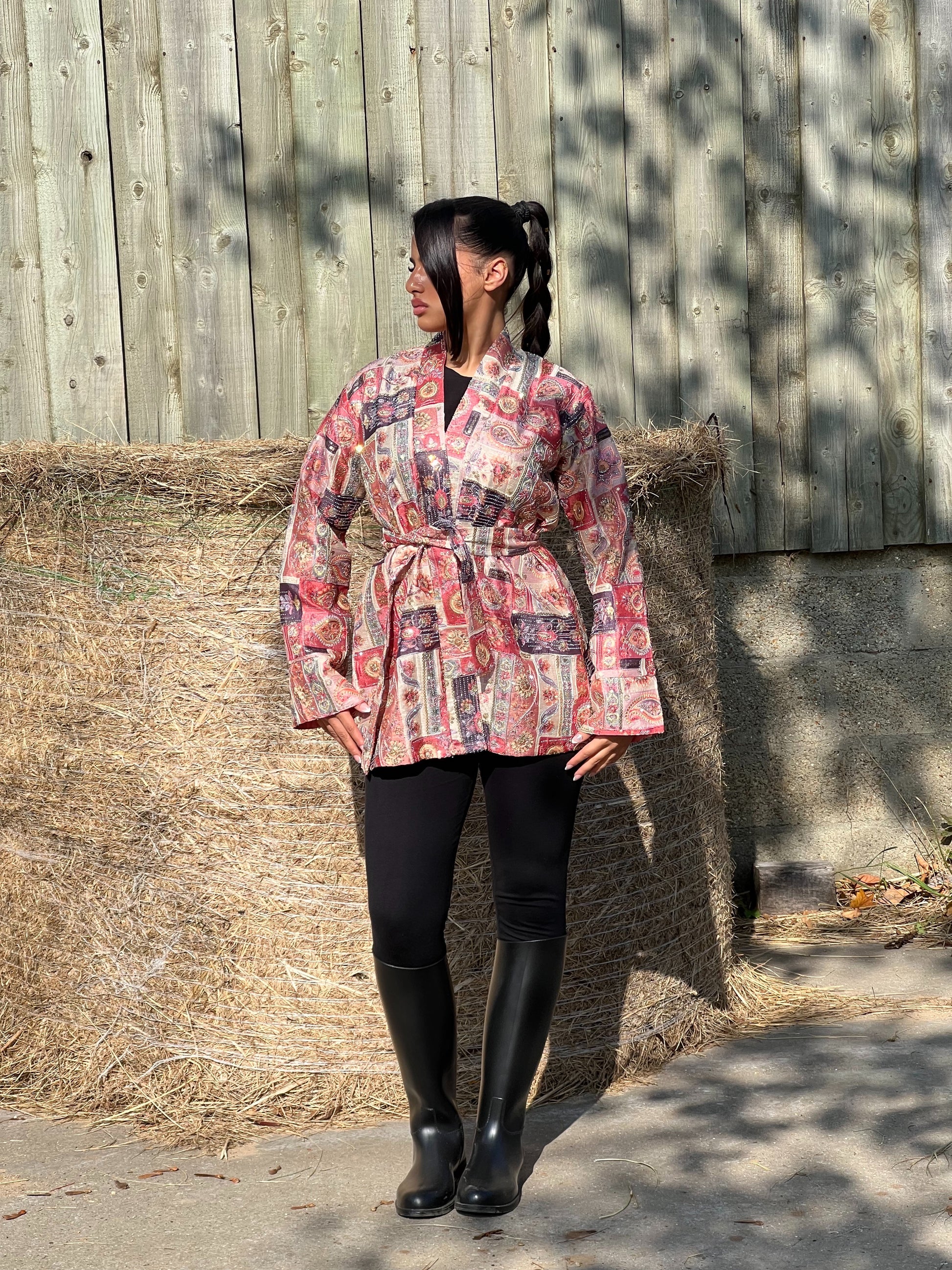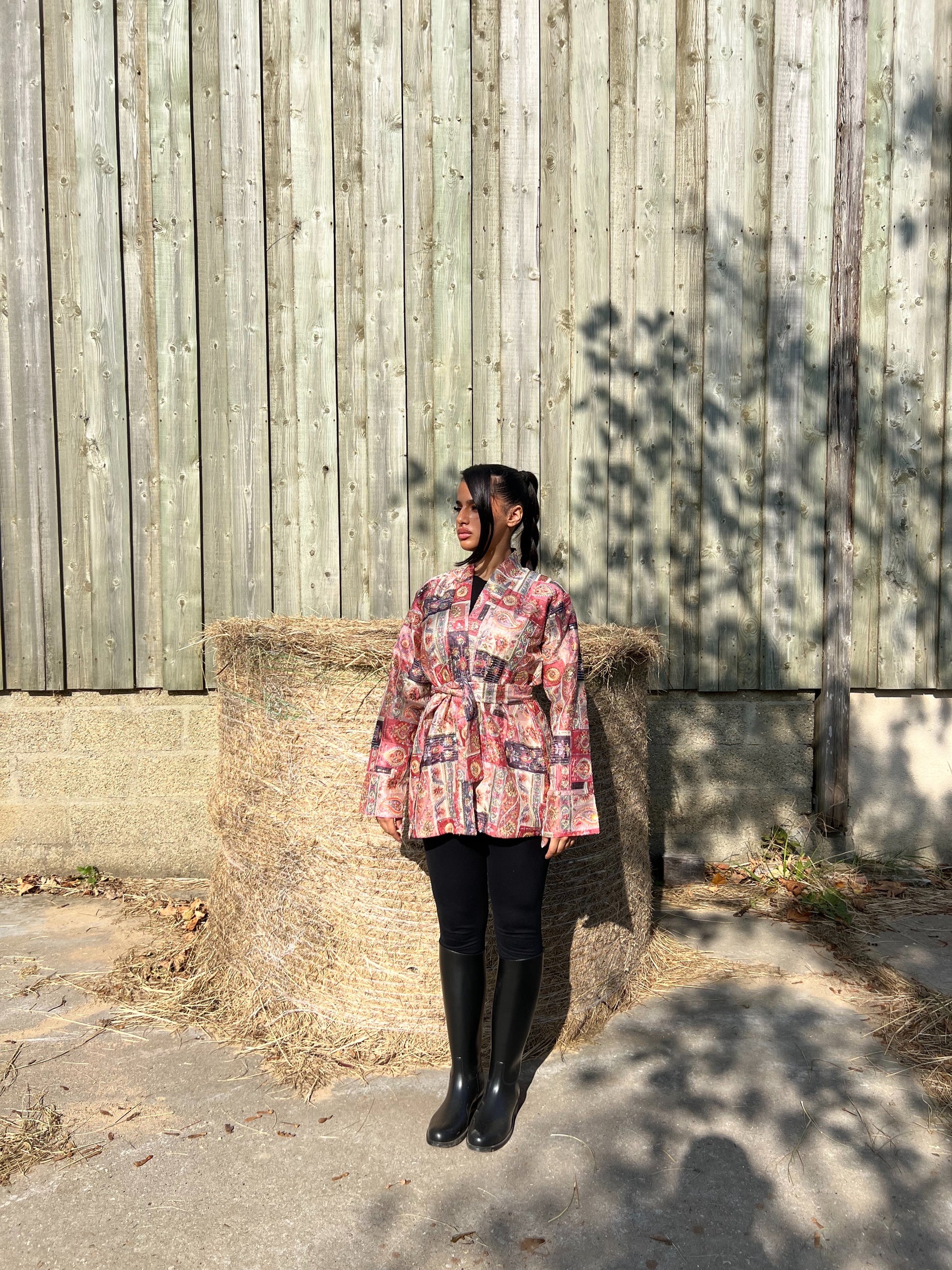 Découvrez la version pink du Kimono Essence Unique : une variation chaleureuse et intense de ce modèle signature. Son tissu précieux mélange des tons rose poudré, dorés, bruns, brodés de motifs orientaux et ornés de sequins qui captent la lumière à chaque mouvement.