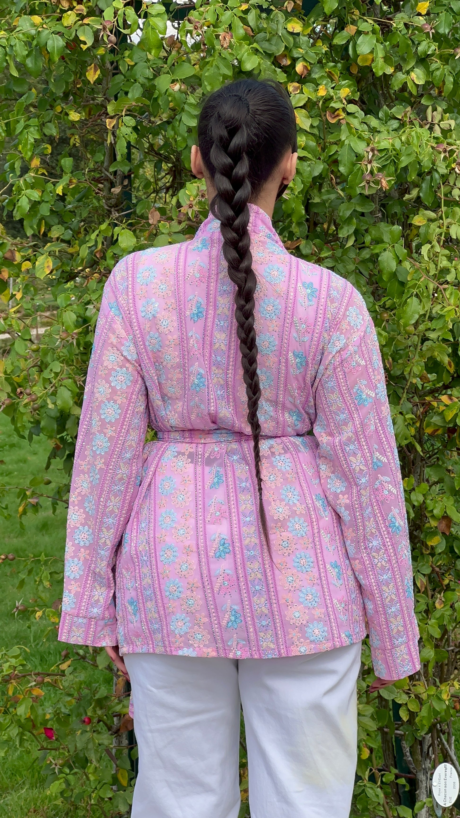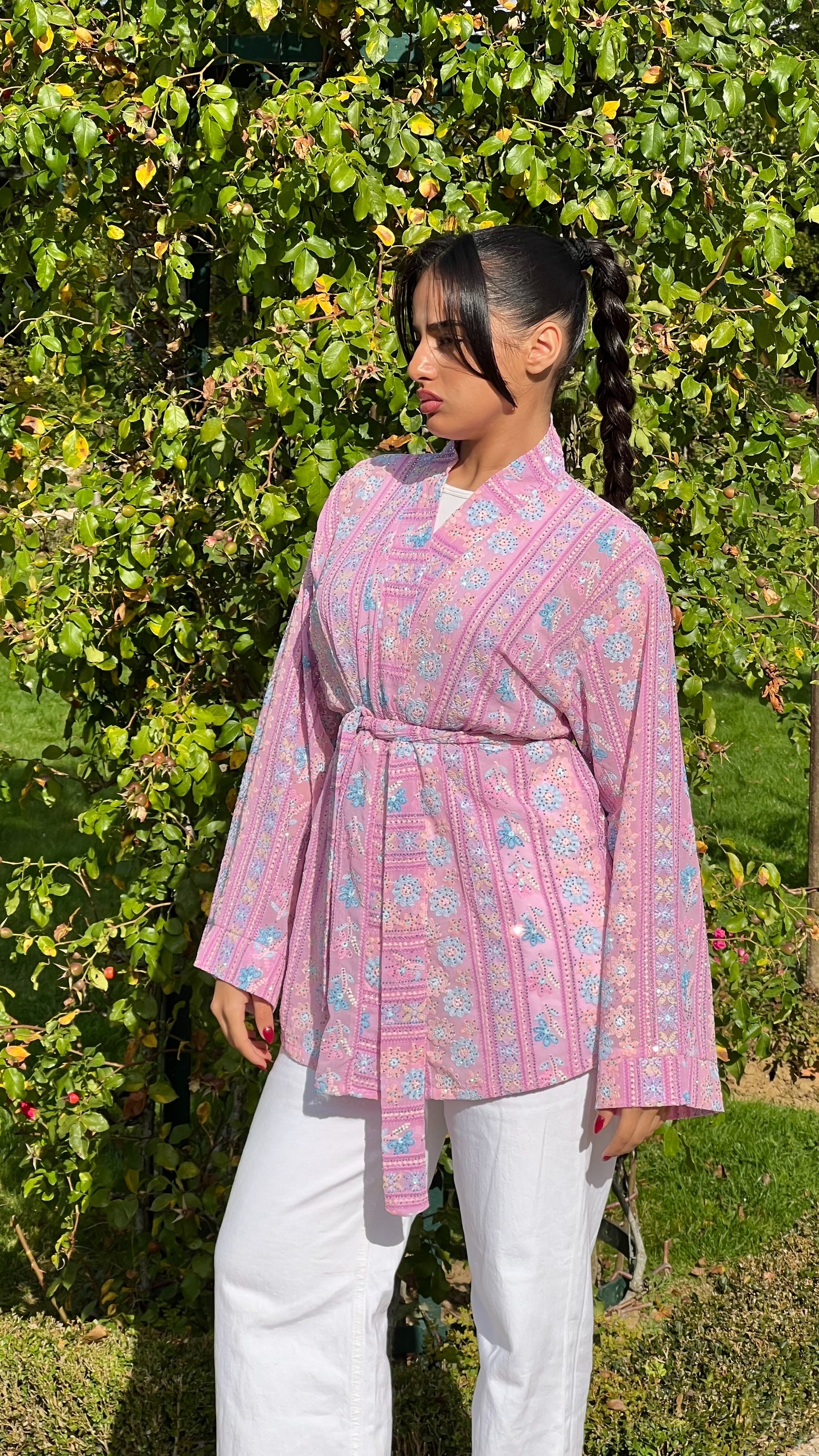 Le kimono PINK FLOWERS incarne la douceur des nuances rose claire et pastel, sublimées par des broderies florales réalisées à la main. Chaque détail est rehaussé de fils dorés et de strass scintillantes, offrant une brillance délicate à chaque mouvement.