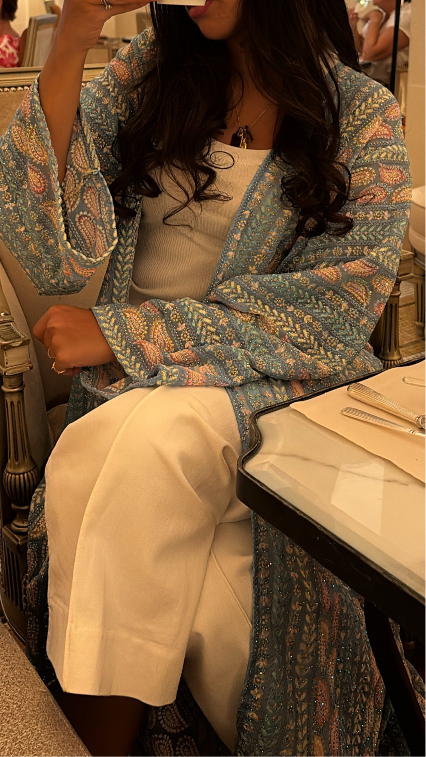 Le kimono ALMIRA dévoile une palette douce et précieuse aux nuances de bleu céladon et d’or rose. Ses broderies méticuleusement réalisées à la main sont rehaussées de perles scintillantes et de fils dorés qui capturent la lumière avec élégance.