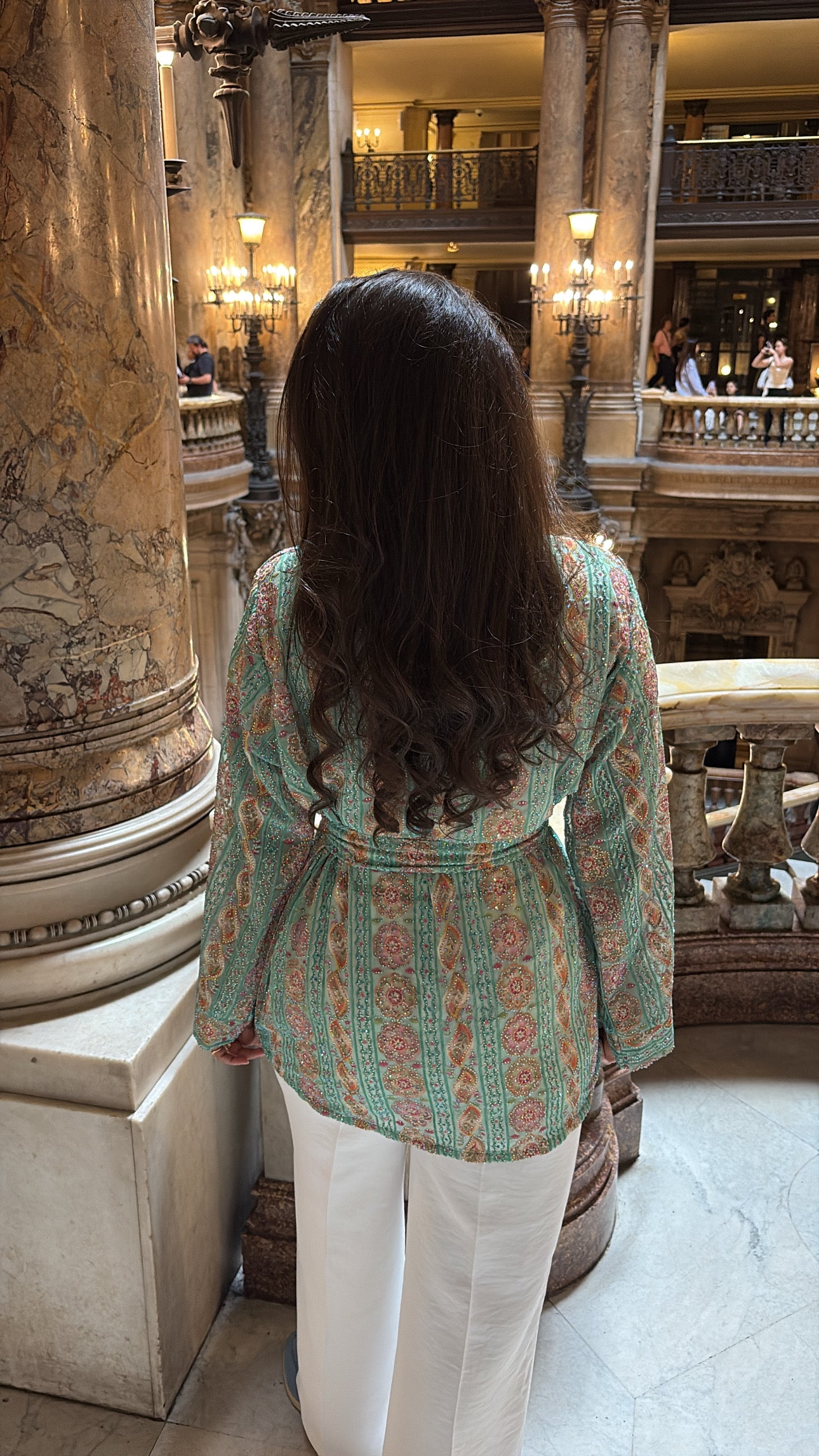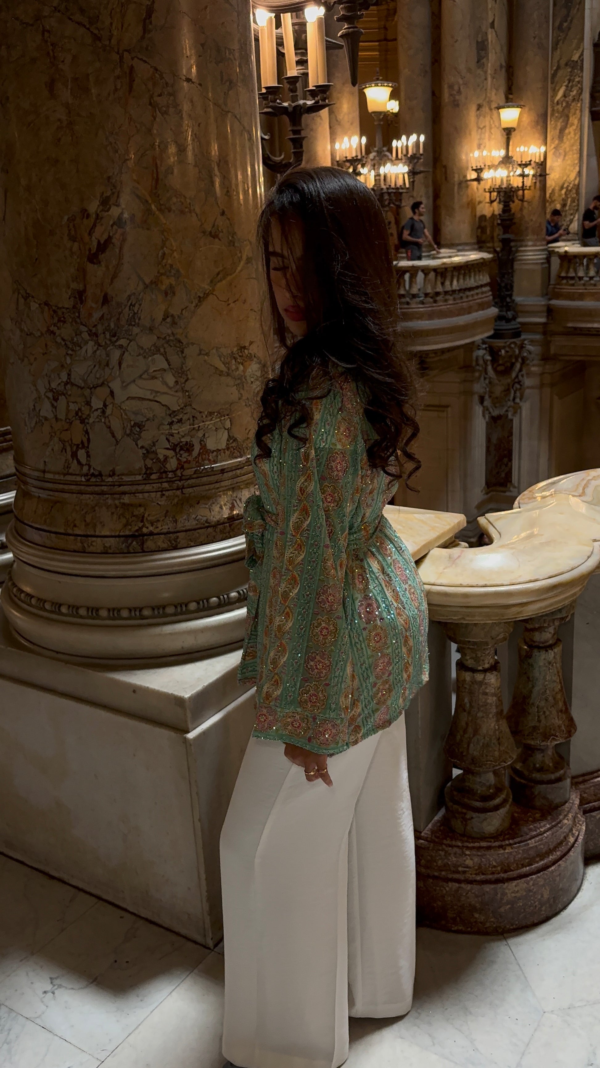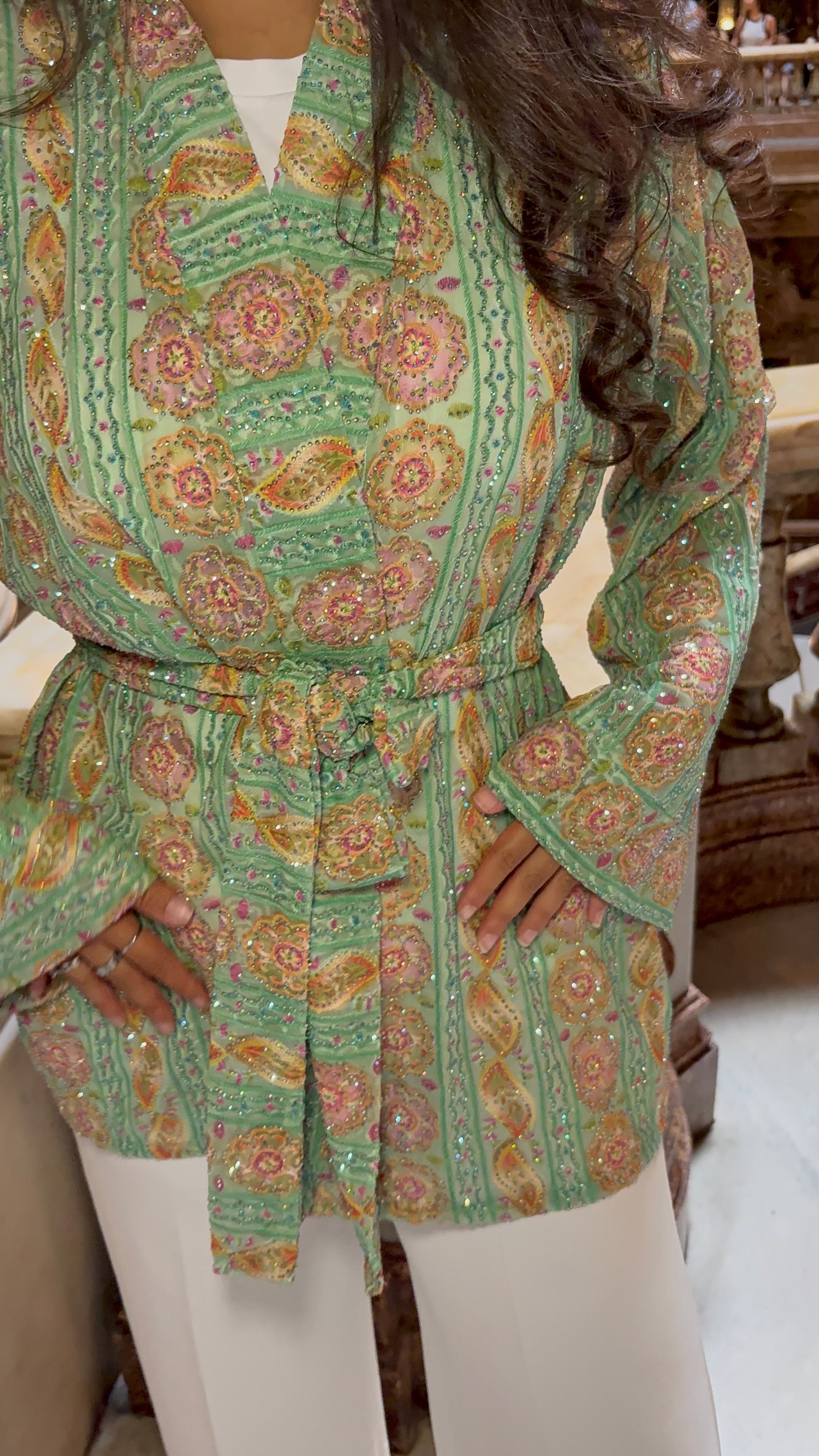 Inspiré des jardins orientaux, le Kimono VERDE séduit par son imprimé délicat aux nuances de vert tendre et d’orange safran, sublimé par des touches dorées et des strass délicatement posés à la main. Chaque pièce est entièrement réalisée à la main et ne sera pas reproduite, garantissant à celle qui le porte une création unique et précieuse.